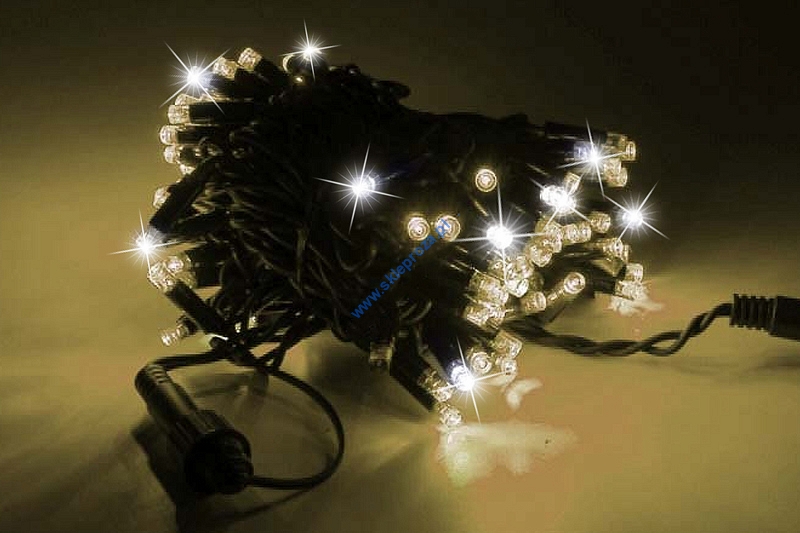 Diody LED sznur świetlny z efektem błysku (co 10 dioda miga na biało) z dodatkowym gniazdem (możliwość łączenia kompletów), na czarnym gumowanym przewodzie.