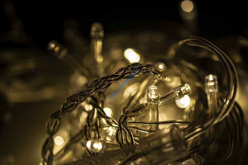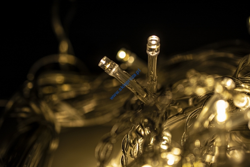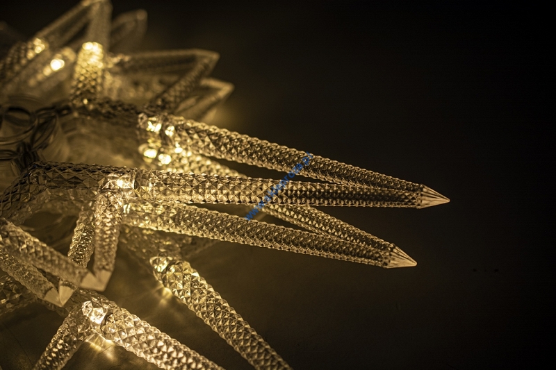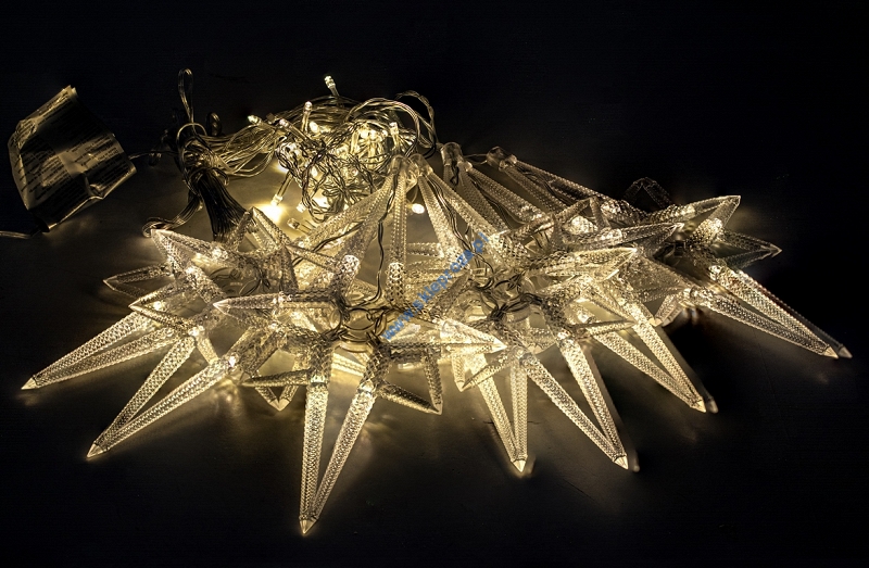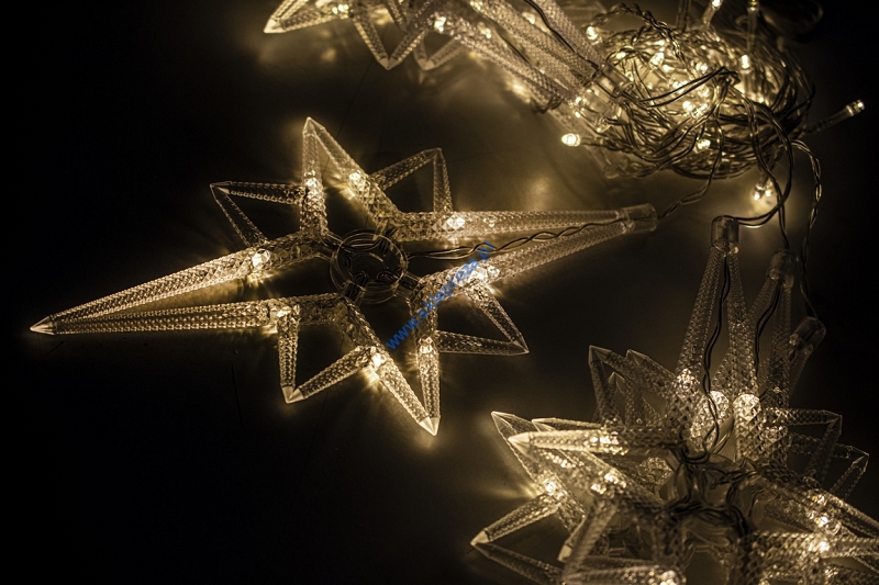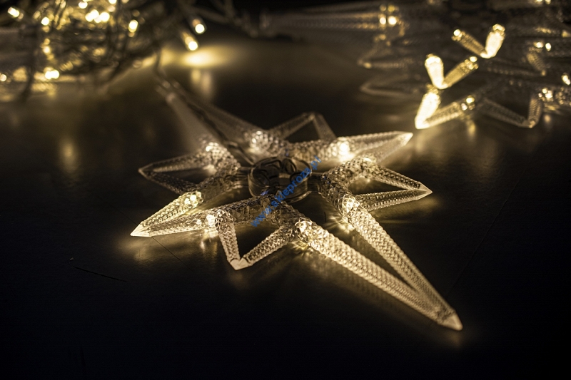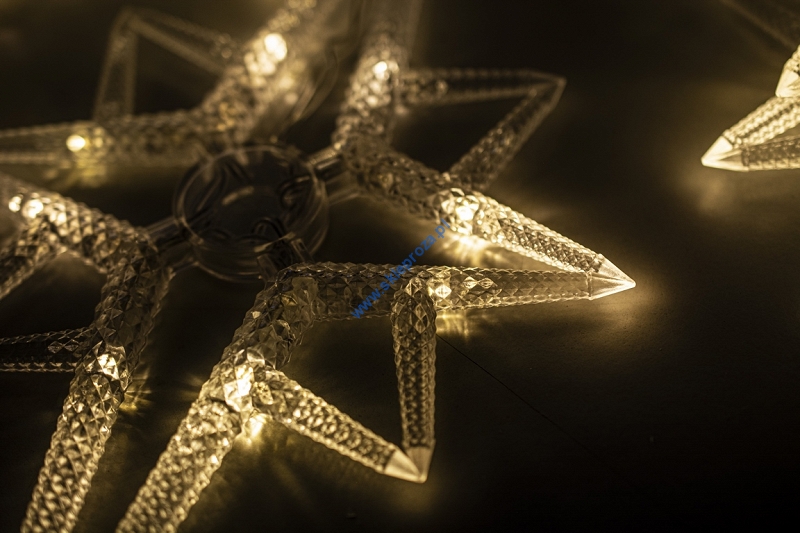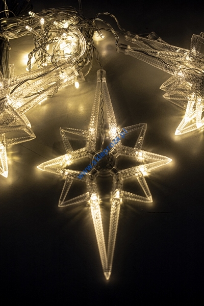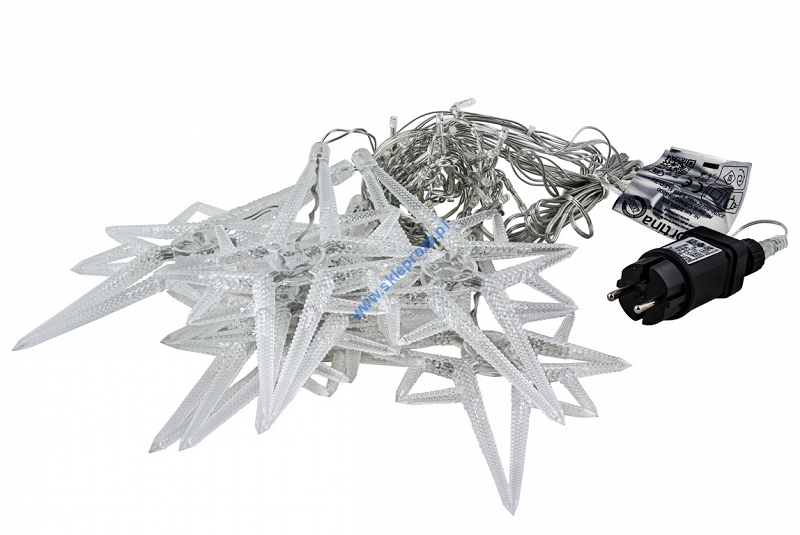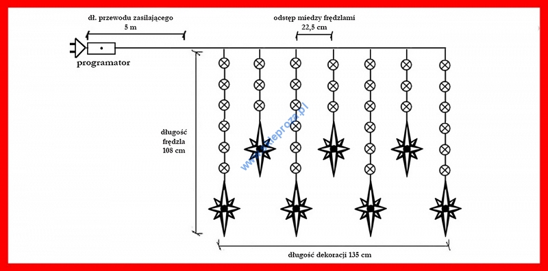 Dekoracyjna kurtyna zewnętrzna FIGURKI LED GWIAZDY POLARNE z programatorem (8 funkcji sterowania), na przezroczystym przewodzie. Kurtyna składa się z 7 frędzli z punktami LED oraz FIGURKI GWIAZDY POLARNEJ umieszczonej na końcu każdego frędzla.