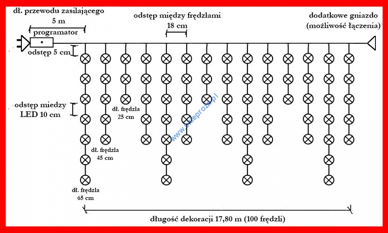 Diody LED Kurtyna z programatorem (8 funkcji sterowania) z dodatkowym gniazdem (możliwość łączenia kompletów). Na białym przewodzie.