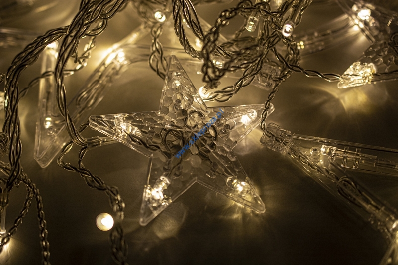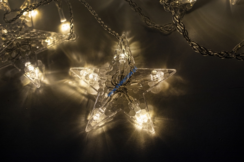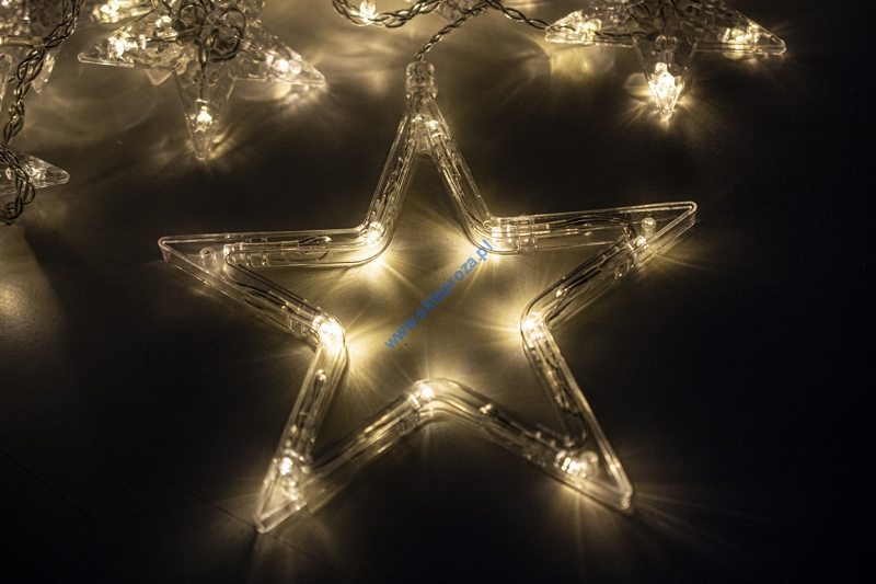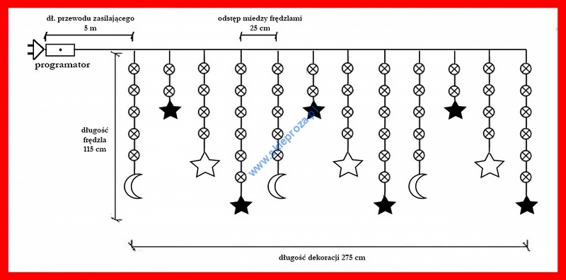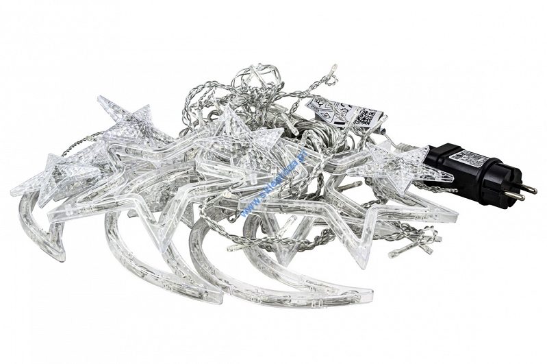 Dekoracyjna kurtyna zewnętrzna FIGURKI LED GWIAZDY i KSIĘŻYCE z programatorem (8 funkcji sterowania), na przezroczystym przewodzie. Kurtyna składa się z 12 frędzli z punktami LED oraz FIGUREK - DUŻA GWIAZDA, MAŁA GWIAZDA oraz KSIĘŻYC umieszczonymi na końcu każdego frędzla.