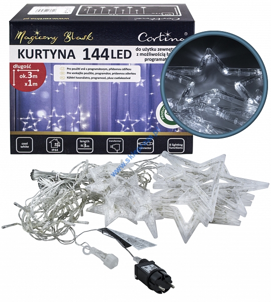 Kurtyna 310 cm Gwiazdki 144 LED PROGRAMATOR+GNIAZDO, zewnętrzne, biały zimny 1/20/CUR/CW