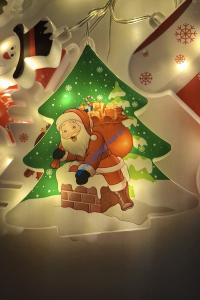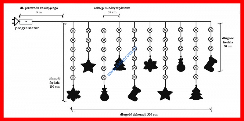 Dekoracyjna kurtyna zewnętrzna FIGURKI LED z programatorem (8 funkcji sterowania), na przezroczystym przewodzie. Kurtyna składa się z 10 frędzli długości 50 cm i 100 cm z punktami LED oraz FIGURKI umieszczonej na końcu każdego frędzla.