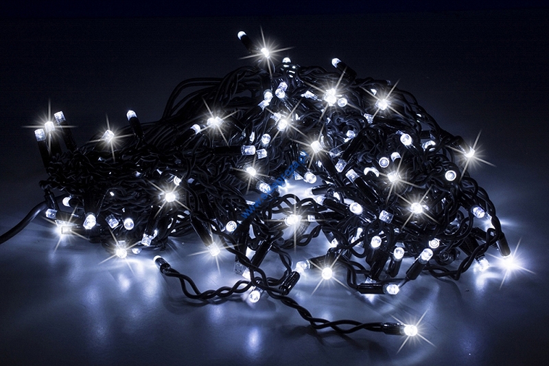 Diody LED Kurtyna z efektem błysku (co 10 dioda miga na biało) z dodatkowym gniazdem (możliwość łączenia kompletów) na czarnym gumowanym przewodzie.