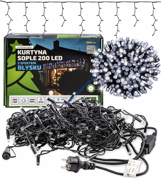 Kurtyna LED 200 pkt. z efektem błysku z dodatkowym gniazdem, biały zimny+błysk biały zimny, zewnętrzna LED200/G/S/5M/P