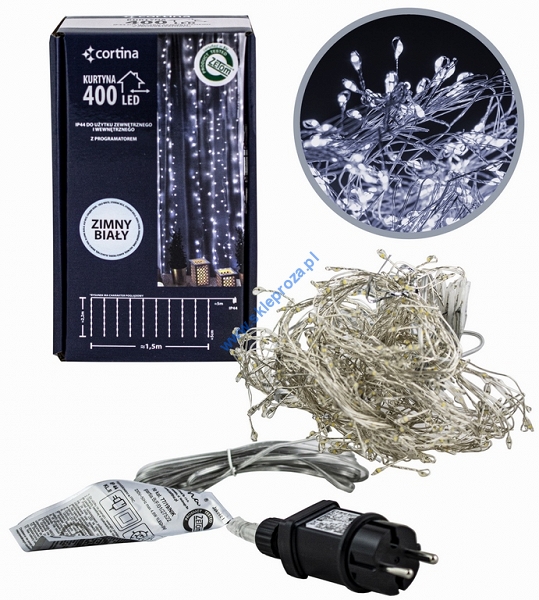 Kurtyna LED 400 pkt. 135x190cm z programatorem, na druciku, zewnętrzna, biały zimny 77/19/NIK/CW