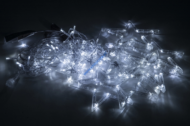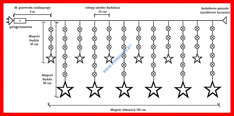 Dekoracyjna kurtyna zewnętrzna GWIAZDKI LED z programatorem (8 funkcji sterowania) z dodatkowym gniazdem (możliwość łączenia), na przezroczystym przewodzie. Kurtyna składa się z frędzli długości 40 cm i 80 cm z punktami LED oraz gwiazdki umieszczonej na końcu każdego frędzla.