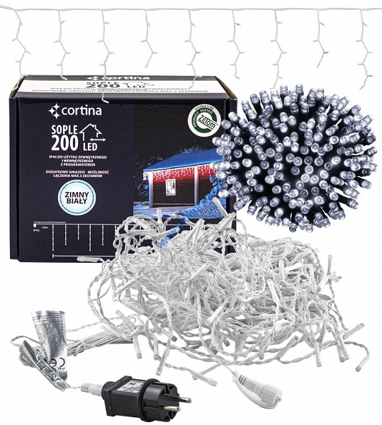 Kurtyna 7m 200 LED programator+gniazdo, zewnętrzne, biały zimny 102/20/LED/CW