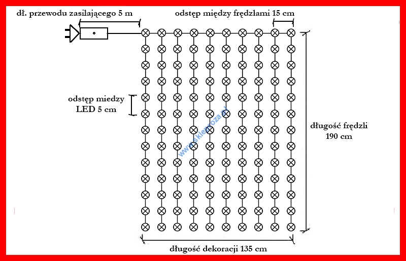 Długość frędzli: 10 frędzli po 195 cm każdy.Na każdym frędzlu 40 LED