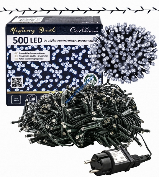 Sznur 25m 500 LED PROGRAMATOR 8 FUNKCJI + PAMIĘĆ, zewnętrzne, biały zimny 620/21/LED/CW