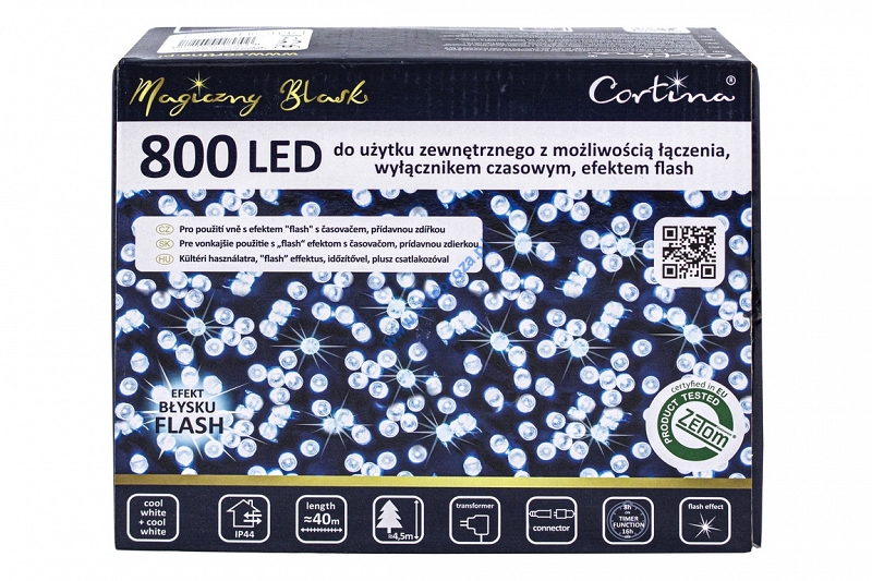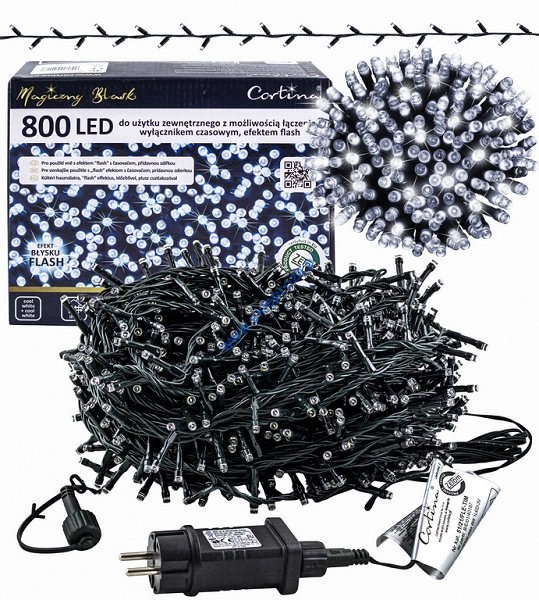Sznur 40m 800 LED FLASH + TIMER + GNIAZDO zewnętrzne, biały zimny+biały zimny flash 51/21/FLE-TIM/CW+CW