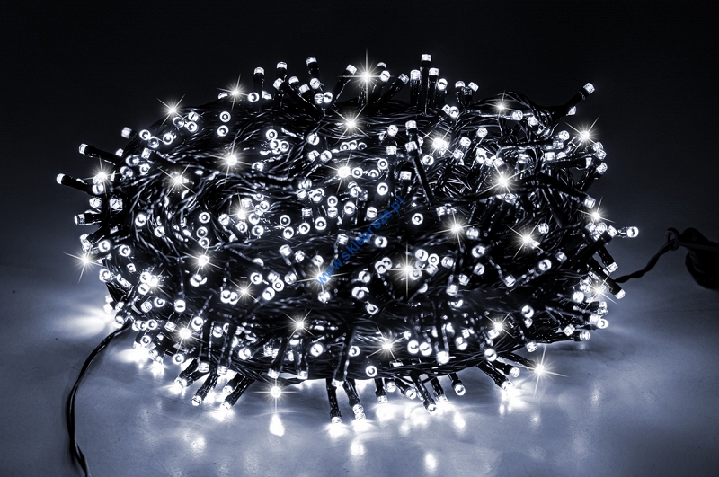 Diody LED sznur świetlny z efektem flash (co 10 dioda miga na biało zimny) z dodatkowym gniazdem (możliwość łączenia MAX 3 kompletów). Na ciemno zielonym przewodzie.