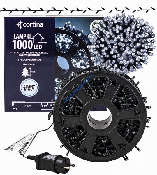 Sznur 50m 1000 LED na SZPULI PROGRAMATOR 8 FUNKCJI + PAMIĘĆ, zewnętrzne, biały zimny 638/21/LED/CW-SZPULA
