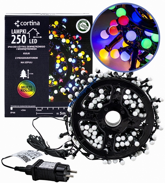 Sznur 5m 250 LED na SZPULI, Kuleczki śr.10mm, programator, zewnętrzne, multi 8/25/LED/M-SZPULA